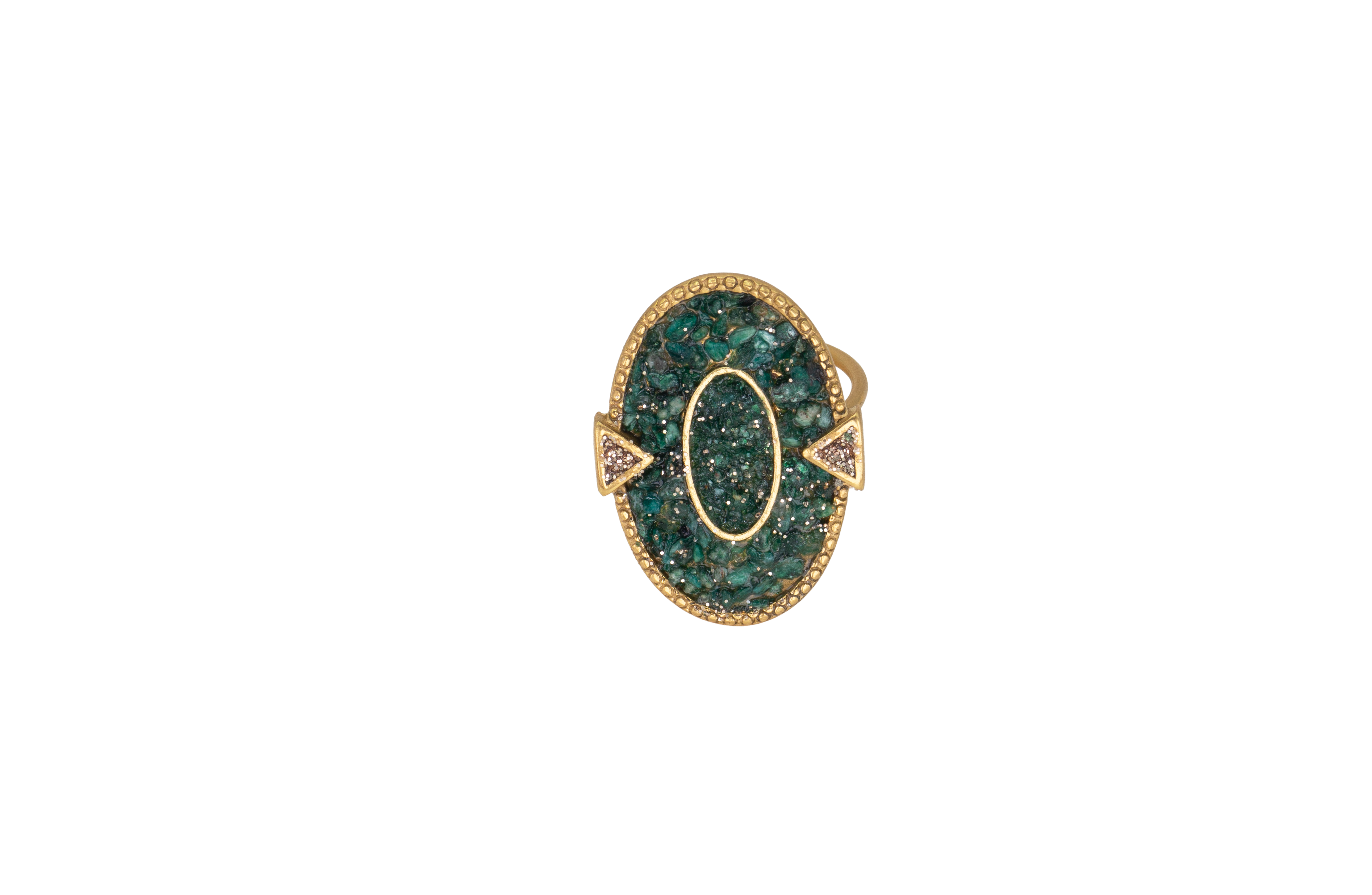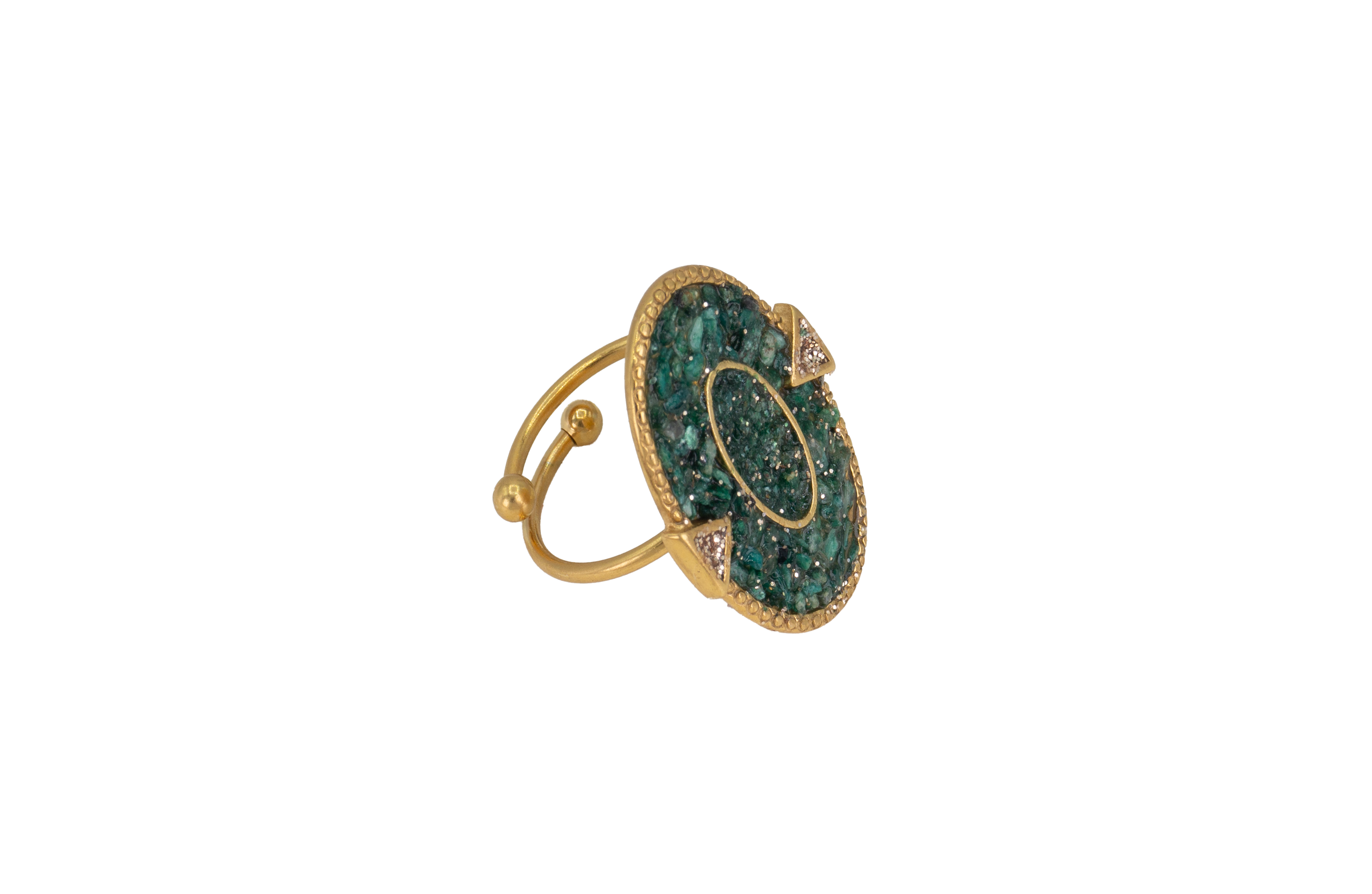 Cette bague au socle ovale est accompagnées de pierres de Fuschite concassées délicatement déposées à la main de façon artisanale au centre du socle ainsi que de pierre dorées sur les deux côtés du socle. Une petite ellipse dorée est déposée au centre