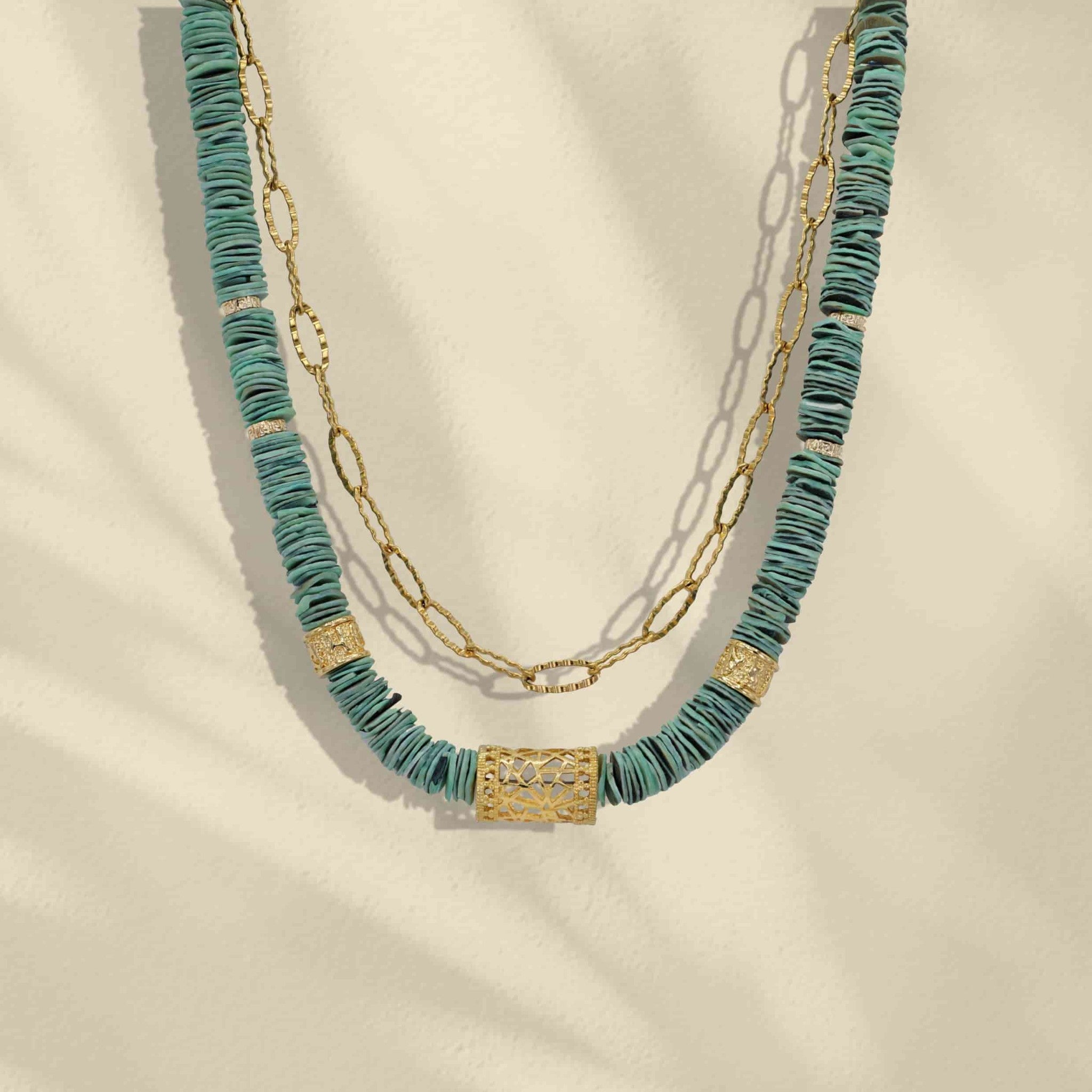 • Les pierres de coquillages coordonnées aux pièces ethniques en laiton doré à l'or fin donnent au collier un caractère à la fois original et distingué.